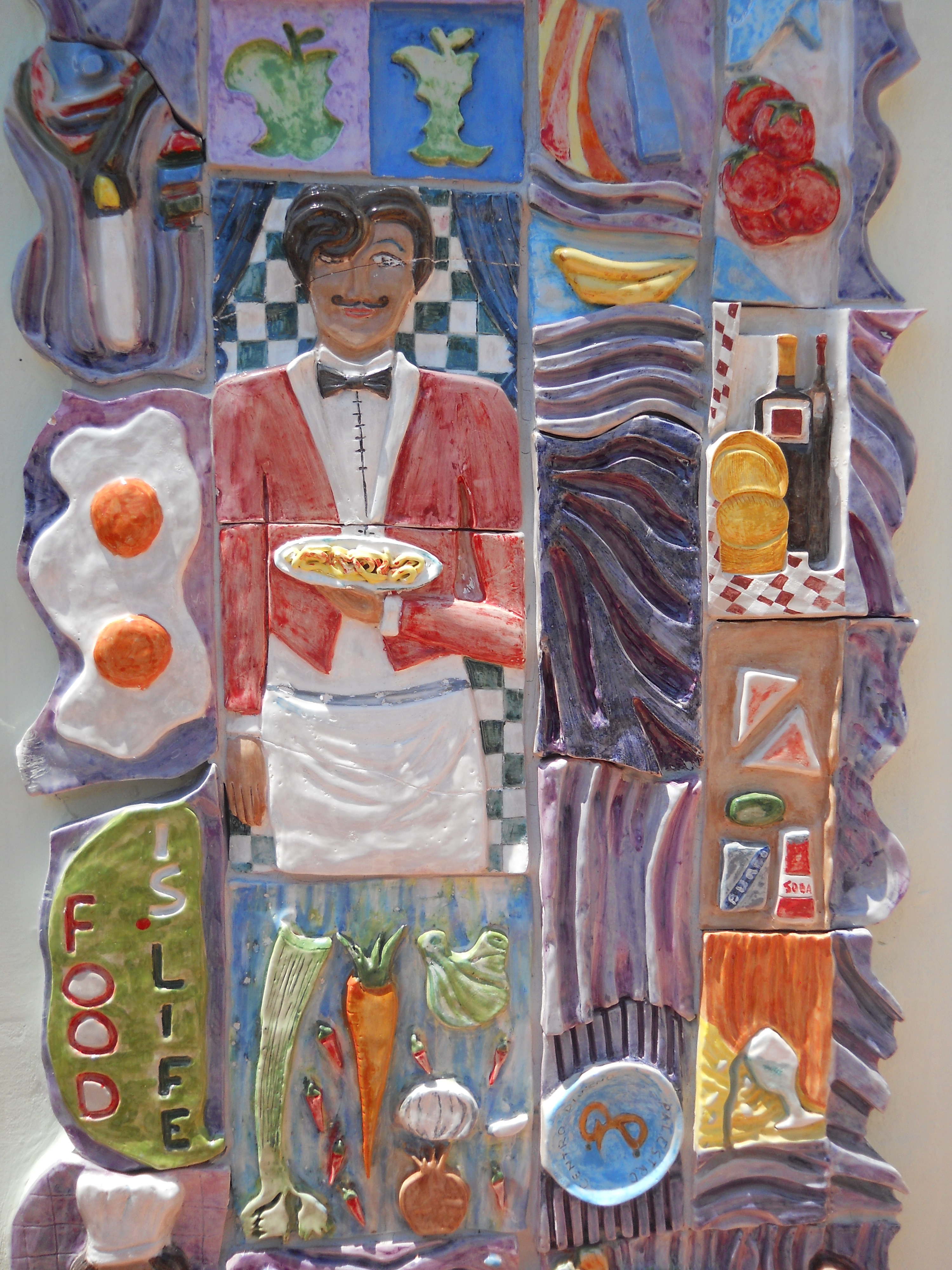 Part. del pannello decorativo eseguito in ceramica e mosaico e donato al Centro Prov. Formazione Professionale Castelfusano (giugno 2014) .