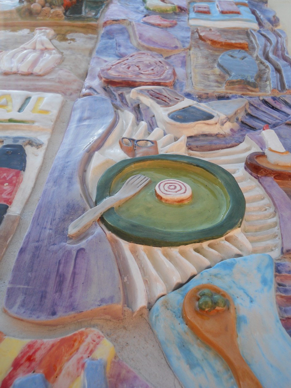 Part. del pannello decorativo eseguito in ceramica e mosaico e donato al Centro Prov. Formazione Professionale Castelfusano (giugno 2014) .
